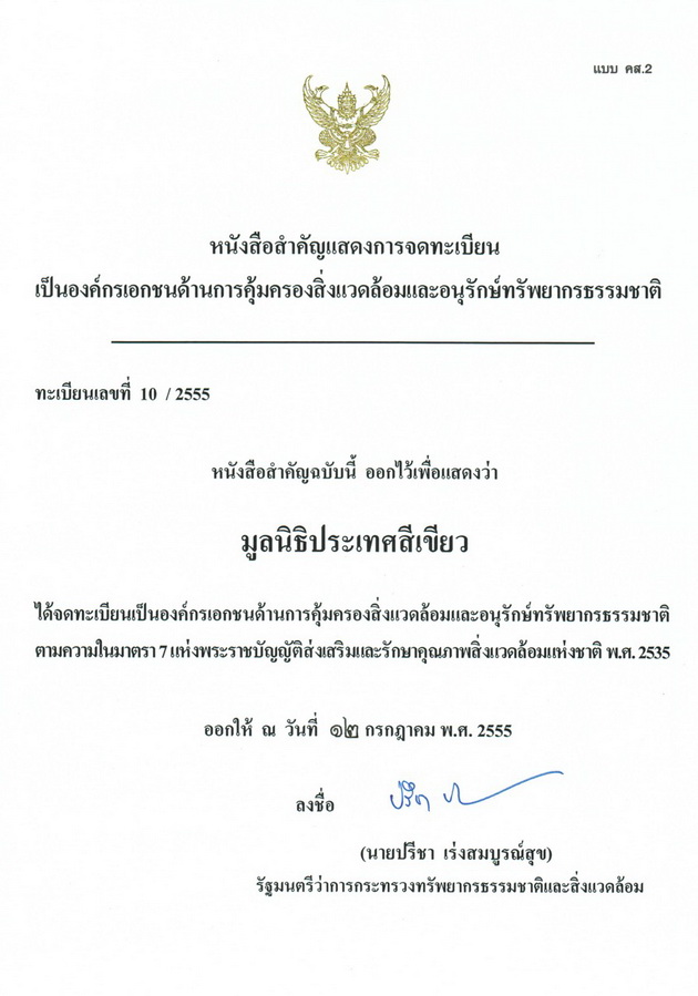 หนังสือสำคัญแสดงการจดทะเบียน เป็นองค์กรเอกชนด้านการคุ้มครองสิ่งแวดล้อมและอนุรักษ์ทรัพยากรธรรมชาติ
